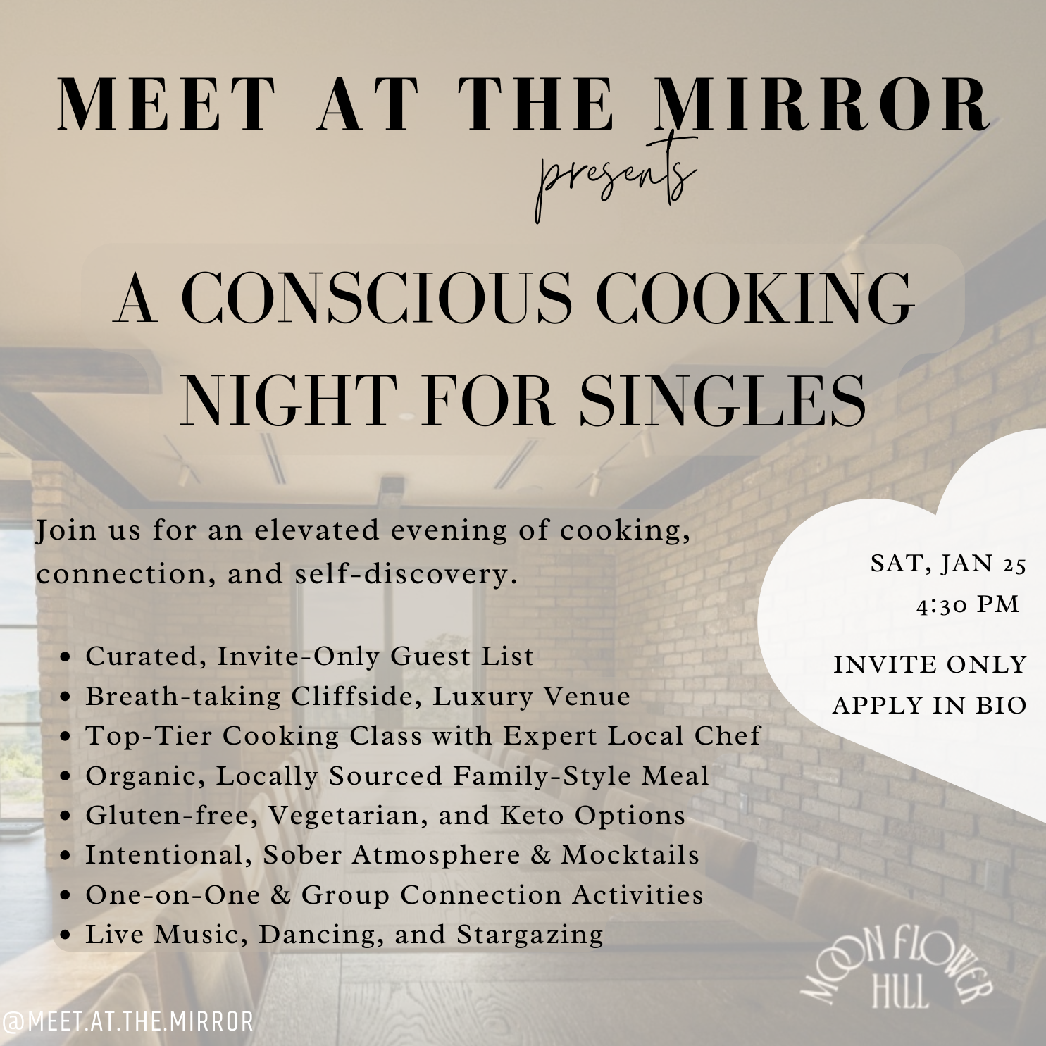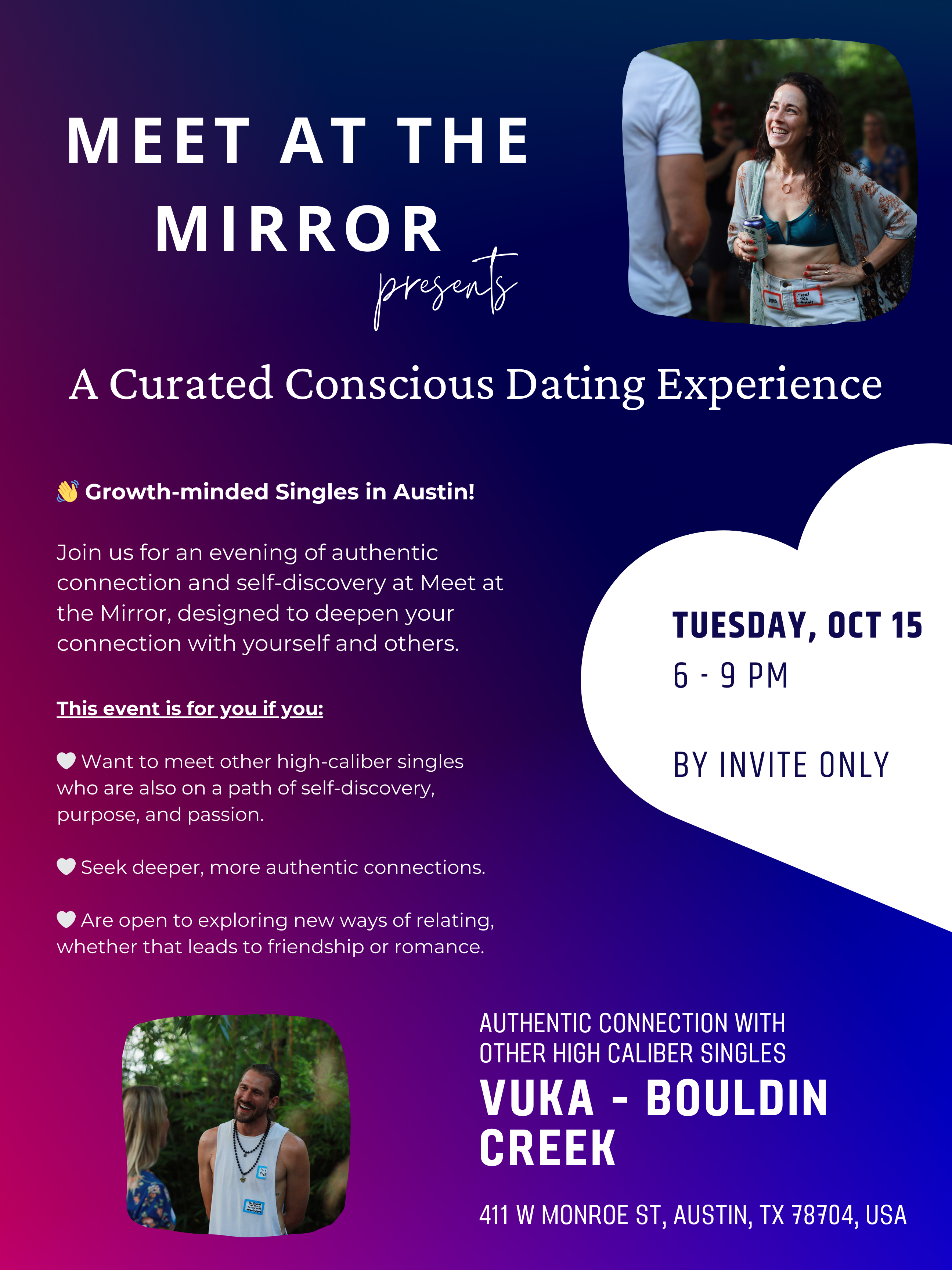 Join us for a dating event like no other! Experience an elevated evening of autParagraphhentic connection and self-discovery at Meet at the Mirror, designed to deepen your connection with yourself and others.