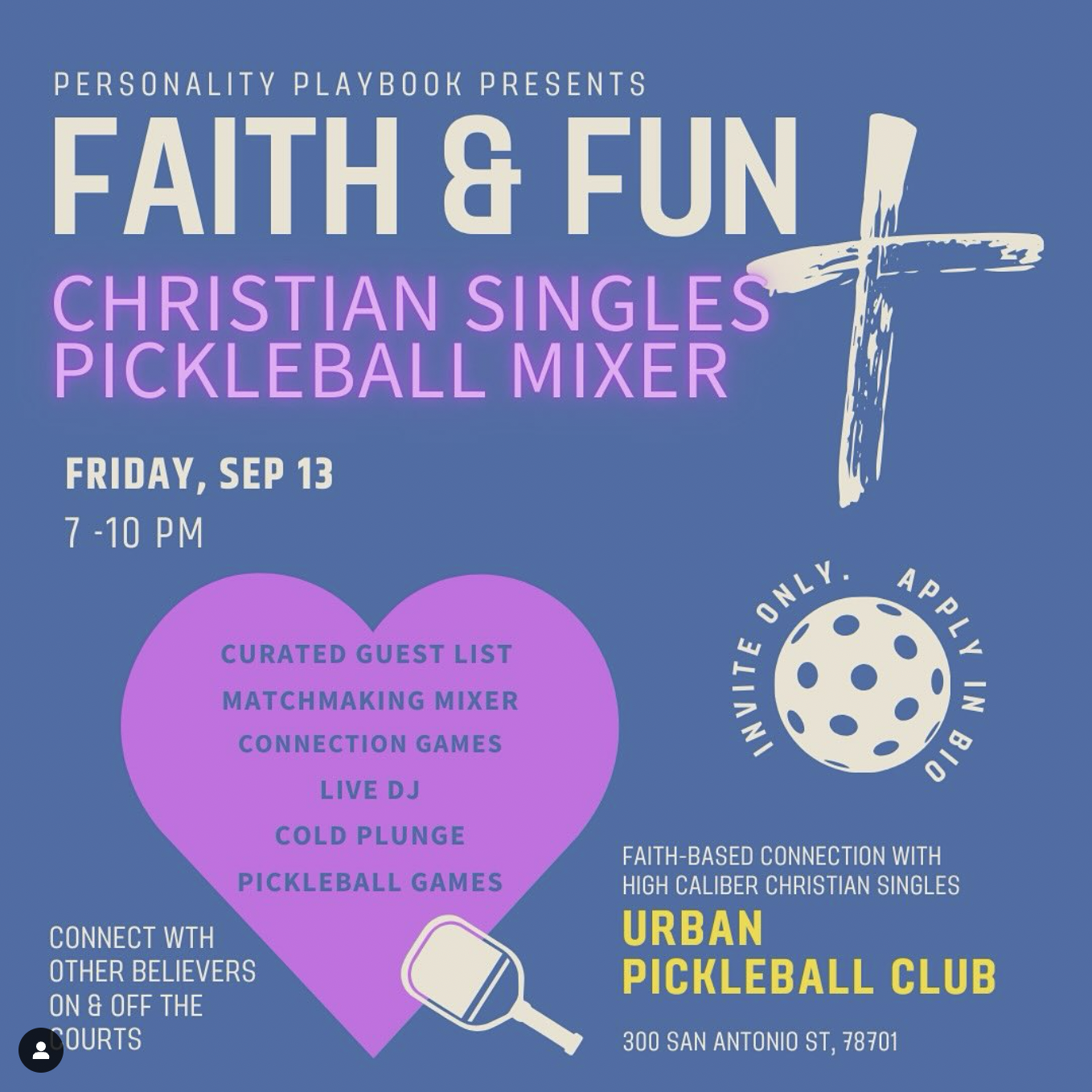 Unlike other dating events, this guest list has been carefully curated to match high caliber Christian singles with similar values and vibes. Enjoy a carefully curated mixer with live music and optional pickleball matches, all set on a gorgeous downtown rooftop with sweeping views of Austin's breathtaking skyline!
