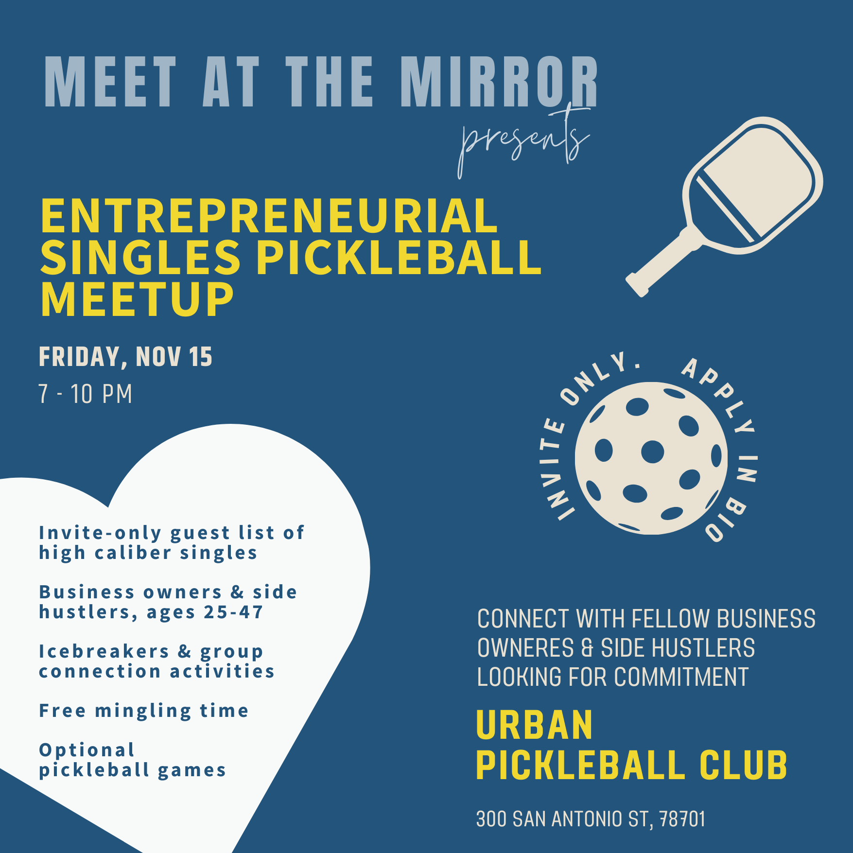 This event will consist of a well-curated mixer, live music, and optional pickleball at a private club in South Austin. Connect with other high caliber singles on and off the courts.